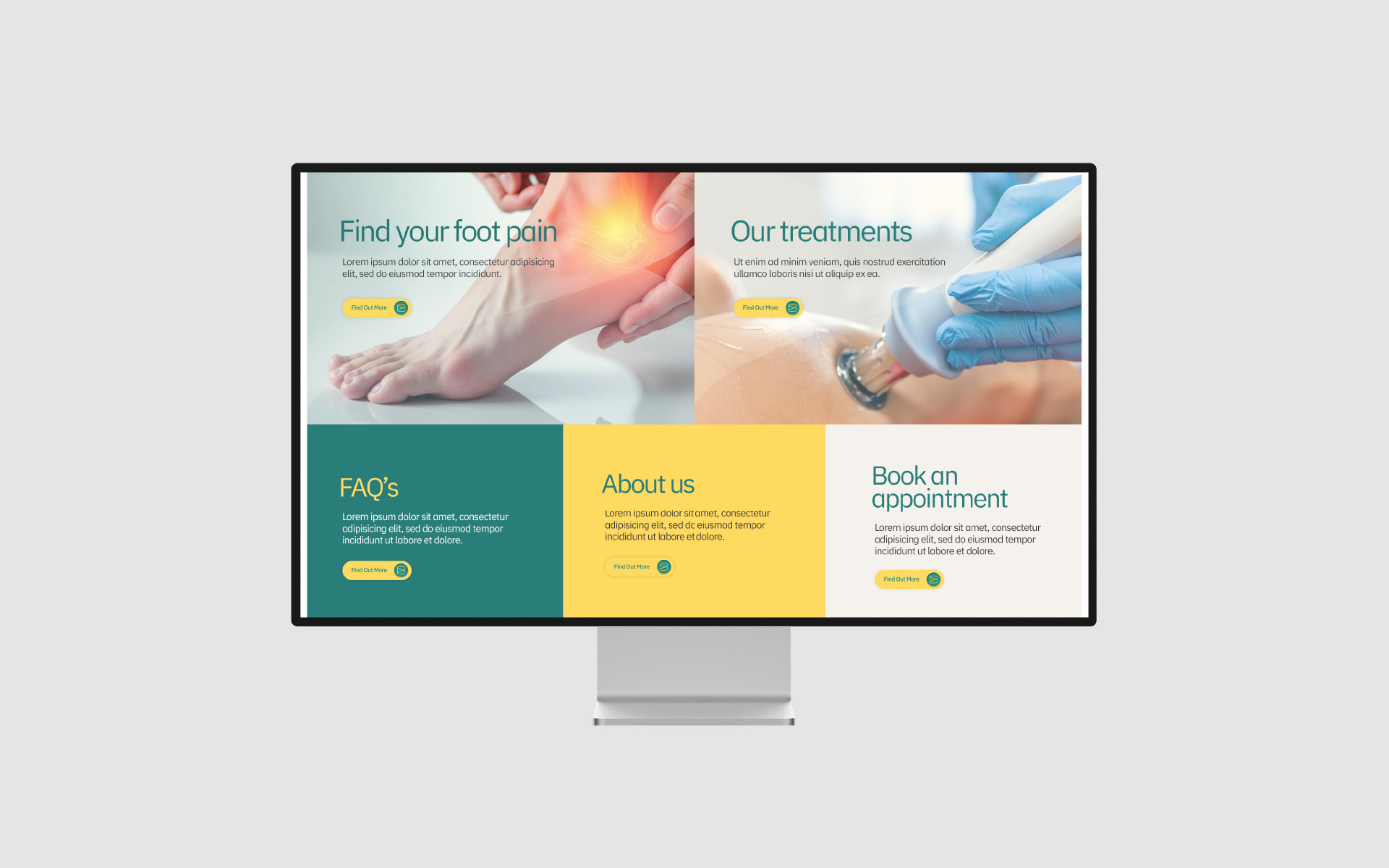 It was important to have the brand have both strong and approachable. The brand designs are aligned with these values, but careful consideration was made to create a brandmark that embodies natural professionalism, that has a timeless sense about it. The brand colours was derived from the sculpture colour palette which sits on the wall in the reception, as the client requested. It was also important when considering the brandmark to be confident and well considered and not be too literal or try to represent foot care in a literal sense as this can become clichéd and over-delivered with regard to the brand icon.