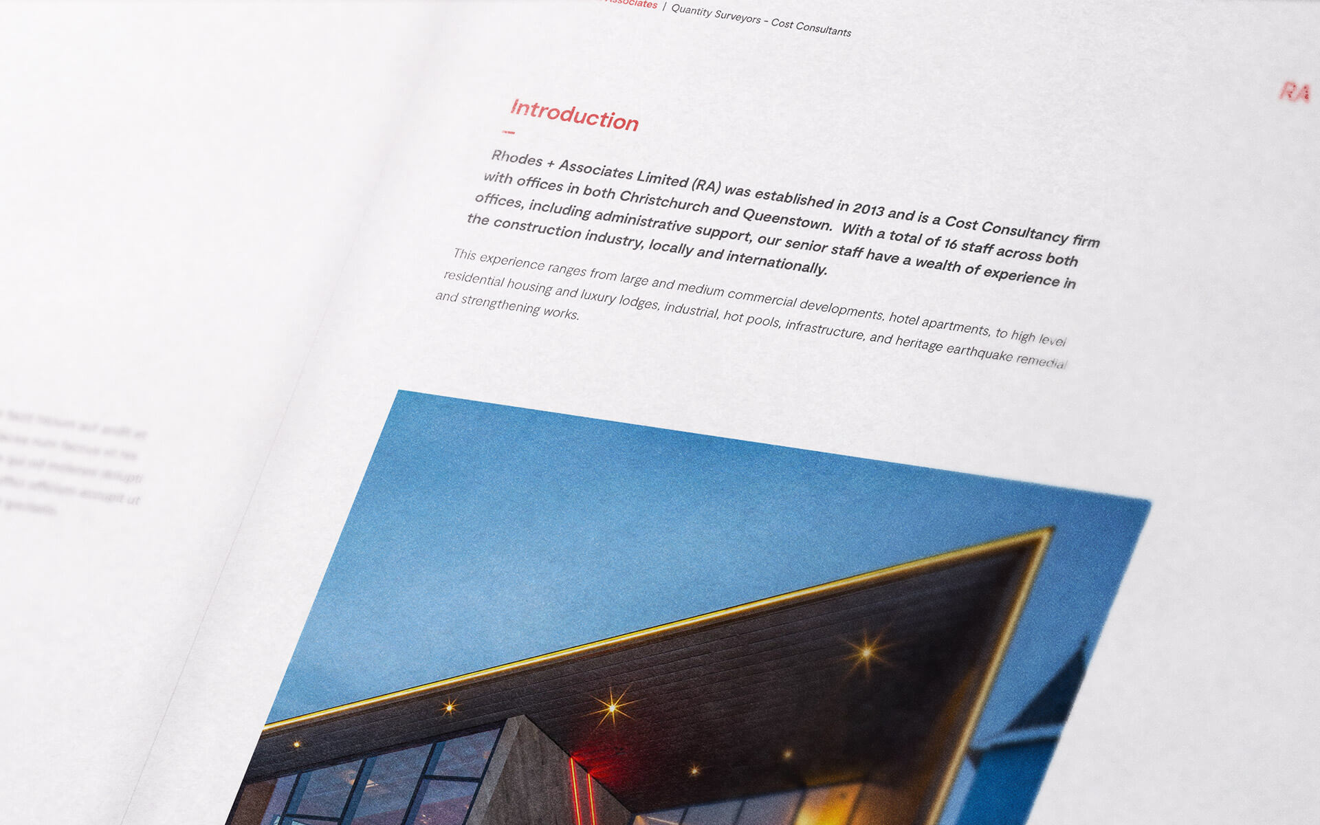 Rhodes + Associates are a renowned quality surveyor and cost consultant based in Christchurch and Queenstown. With the importance of clear and visually appealing proposal documents, they wanted to have there documents reflecting the qualiy natutre ot their experience and service.